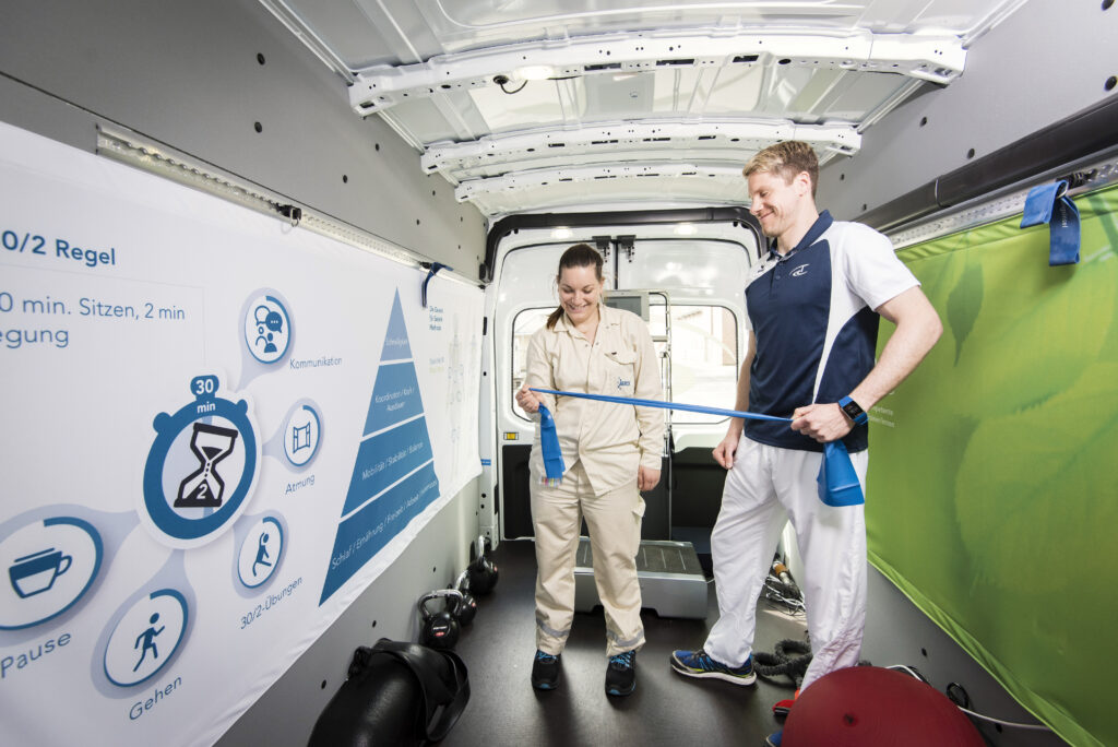 Die „Trainingsinsel“ ist eine der Lösungen, die hierfür als aufsuchende Maßnahme zur Gesundheitsförderung eingesetzt wird. Ein Kleinbus bringt qualifizierte Trainerinnen und Trainer und deren Equipment während der Arbeit direkt zu den einzelnen Betriebsstätten. Bei einem persönlichen Training von zwölf Minuten Dauer wird auf die individuelle Beanspruchung der Mitarbeitenden eingegangen. Es werden ihnen genau jene Übungen gezeigt, die für sie den besten Ausgleich darstellen.